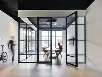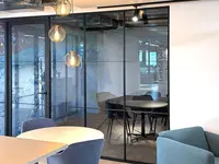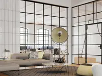 Das System kombiniert transparente Glasflächen mit filigranen Sprossenteilungen und schafft so eine strukturierte Raumwirkung – ideal, wenn Zonenbildung und Design kombiniert werden sollen.